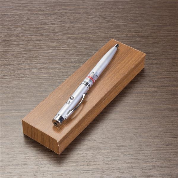 Caneta laser com estojo de madeira. Esferográfica, laser e led(basta apertar os botões), possui clip de metal, abaixo do anel central contém um adesivo de alerta. Estojo em madeira revestido com espuma interna. Caneta aciona por giro. Medidas aproximadas para gravação (CxL): Estojo – 15,4 cm x 4,4 cm – Caneta 4,5 cm x 1,8 cm Tamanho total aproximado (CxL): Estojo 15,5 cm x 4,5 cm x 2 cm – Caneta 13,3 cm x 1,3 cm Peso aproximado (g): 56
