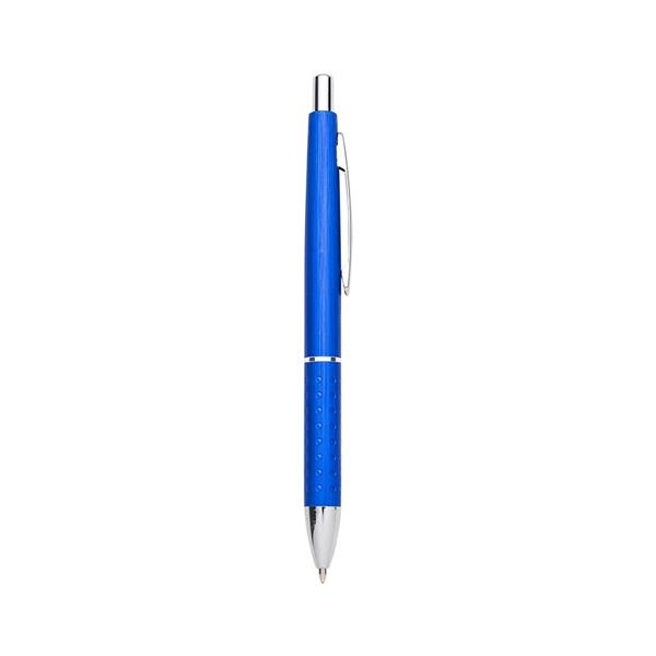 Caneta semimetal com pintura escovada colorida, possui anel inferior prata e detalhes em relevo semelhante a strass. Clip metal prata, aciona por clique. Medidas aproximadas para gravação (CxL): 5 cm x 0,7 cm Tamanho total aproximado (CxL): 14,1 cm x 1,3 cm Peso aproximado (g): 16