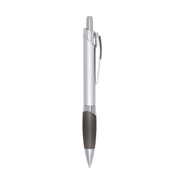 Caneta plástica inteira prata com detalhes coloridos. Possui clip de metal com detalhe plástico colorido, parte inferior colorida emborracha. Aciona por clique. Medidas aproximadas para gravação (CxL): 3,6 cm x 1 cm Tamanho total aproximado (CxL): 14 cm x 1,6 cm Peso aproximado (g): 12