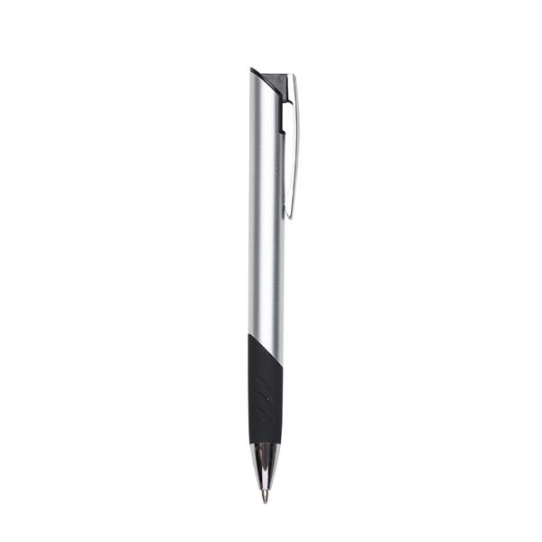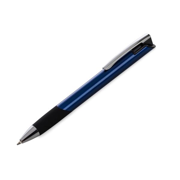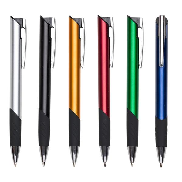Caneta plástica inteira colorida com detalhes preto emborrachado. Clip de metal com suporte preto, possui três linhas nas duas laterais da borracha inferior. Aciona por clique. Medidas aproximadas para gravação (CxL): 3,5 cm x 0,8 cm Tamanho total aproximado (CxL): 13,9 cm x 1,6 cm Peso aproximado (g): 11