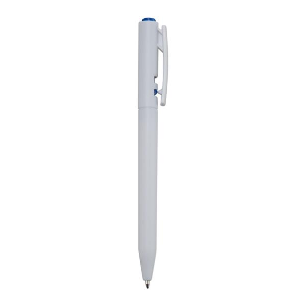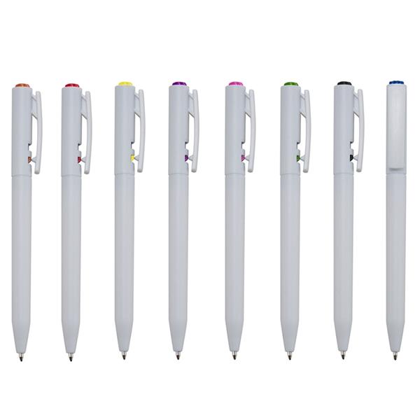 Caneta plástica branca com detalhes coloridos. Anel central e acionador em relevo. Aciona por clique e para destravar basta apertar a parte inferior do clip. Medidas aproximadas para gravação (CxL): 3,9 cm x 0,7 cm Tamanho total aproximado (CxL): 13,7 cm x 1,5 cm Peso aproximado (g): 7