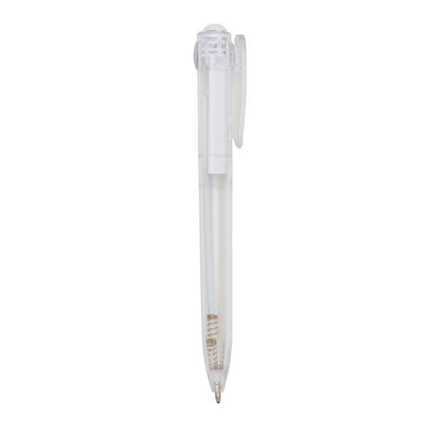 Caneta plástica translúcida inteira colorida com acionador em relevo. Suporte do clip com dois furos em cada lateral e detalhe em relevo, possui anel “vazado” abaixo do clip e detalhes na parte inferior em relevo. Aciona por clique e destrava apertando a parte inferior do clip. Medidas aproximadas para gravação (CxL): 2,8 cm x 1 cm Tamanho total aproximado (CxL): 13,5 cm x 1,9 cm Peso aproximado (g): 8