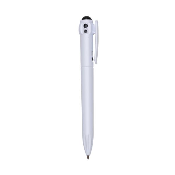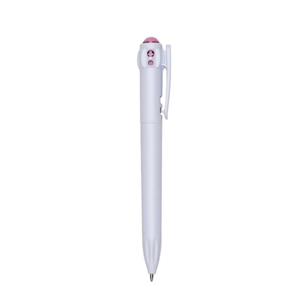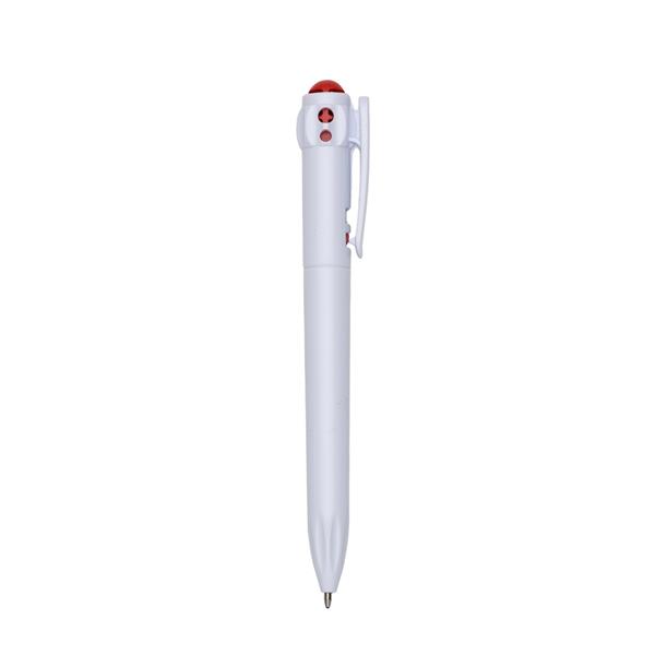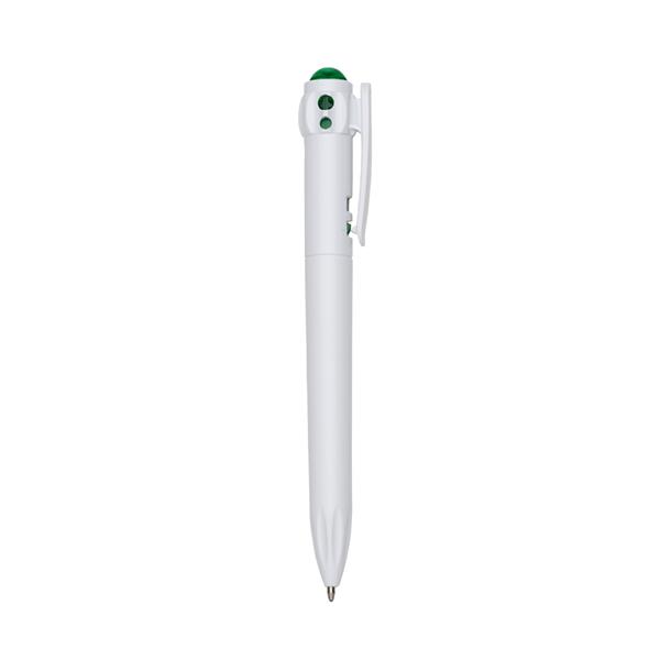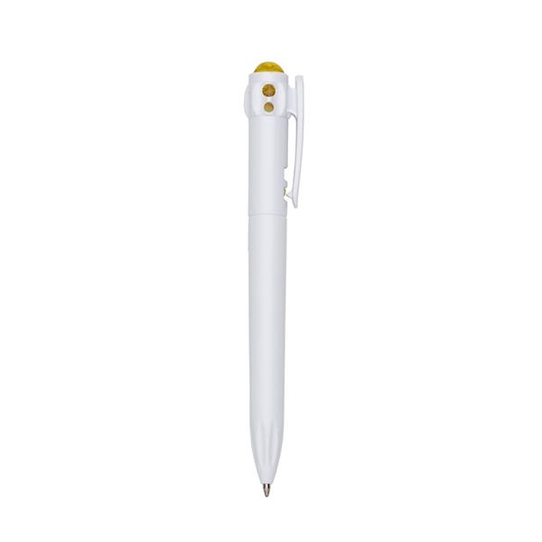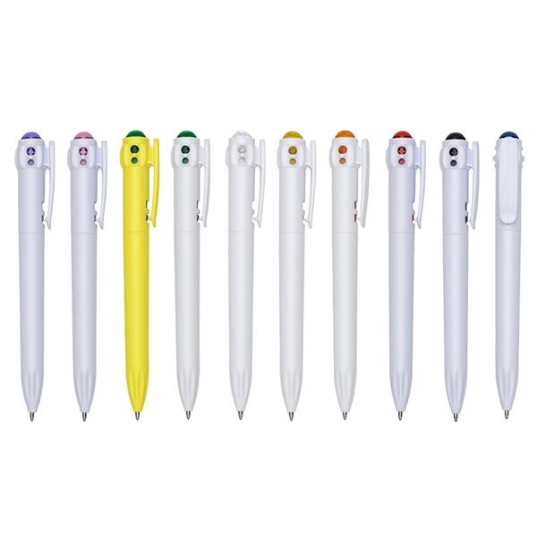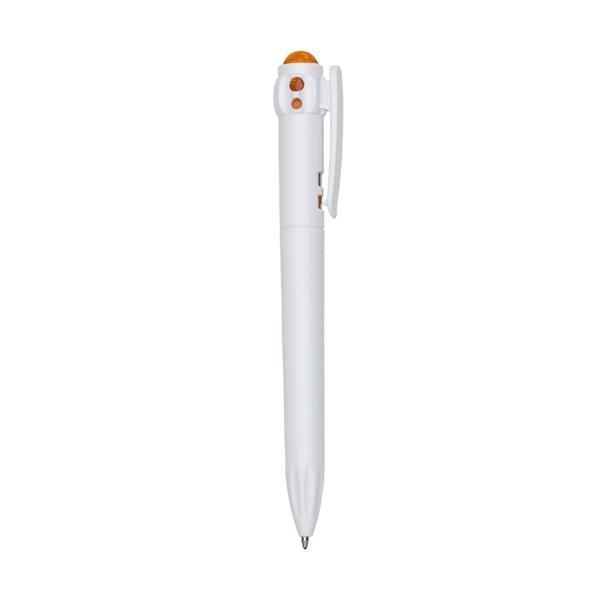 Caneta plástica inteira branca com acionador colorido em relevo. Suporte do clip com dois furos em cada lateral e detalhe em relevo, possui anel “vazado” abaixo do clip e detalhes na parte inferior em relevo. Aciona por clique e destrava apertando a parte inferior do clip. Medidas aproximadas para gravação (CxL): 2,8 cm x 1 cm Tamanho total aproximado (CxL): 13,5 cm x 1,9 cm Peso aproximado (g): 8