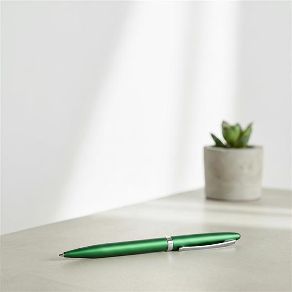 Caneta plástica com clip metálico, acionamento por rotação e carga esferográfica azul de 1.0mm. Altura : 13,1 cm Largura : 1,3cm Peso aproximado (g): 6