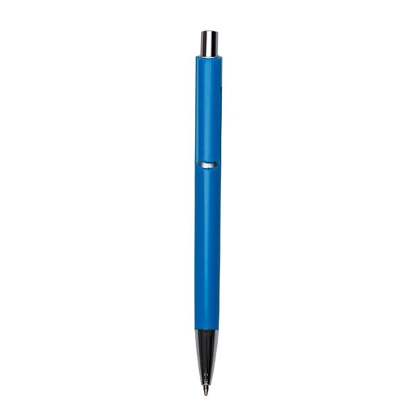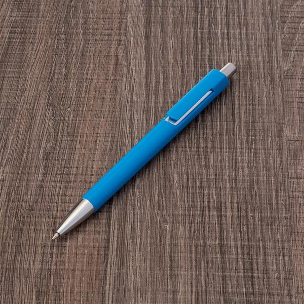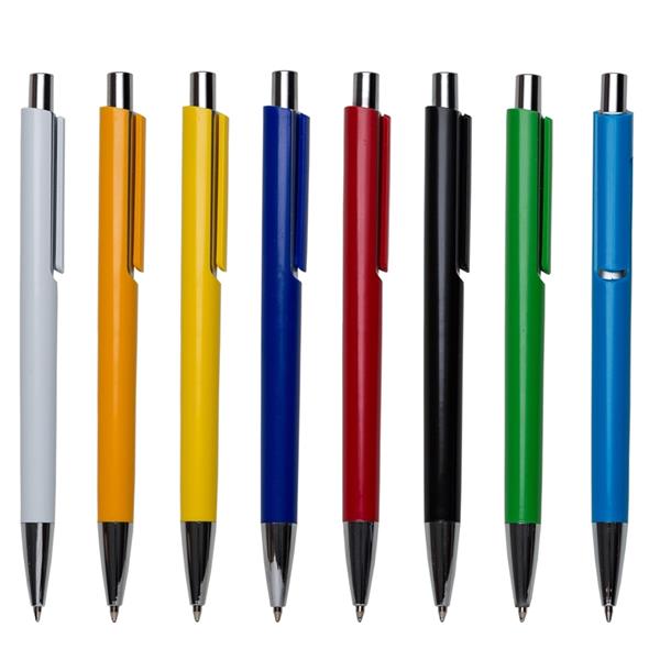 Caneta plástica inteira colorida com detalhes prata. Clip plástico com detalhe vazado e ponteira prata. Aciona por clique. Medidas aproximadas para gravação (CxL): 4 cm x 0,7 cm Tamanho total aproximado (CxL): 14,1 cm x 1,5 cm Peso aproximado (g): 9