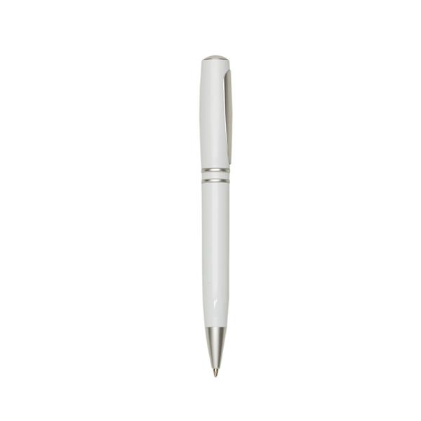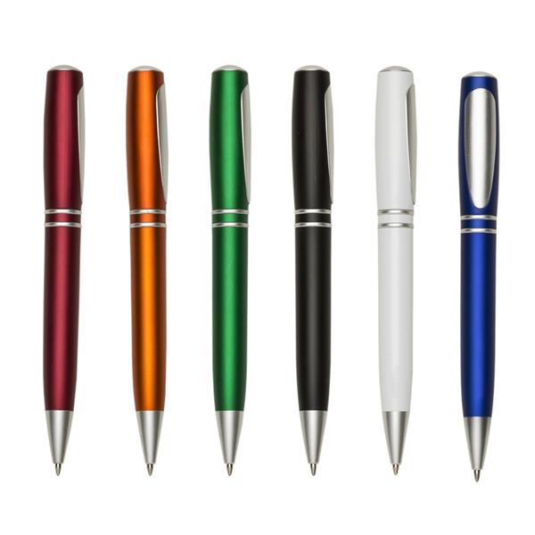 Caneta plástica fosca inteira colorida com detalhes prata. Clip plástico e ponta superior prata, possui dois anéis centrais prata. Aciona por giro. Medidas aproximadas para gravação (CxL): 4 cm x 1 cm Tamanho total aproximado (CxL): 13,6 cm x 1,5 cm Peso aproximado (g): 12