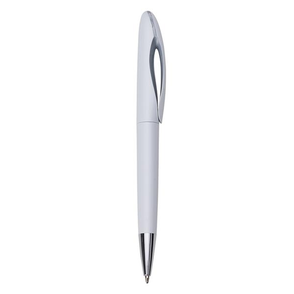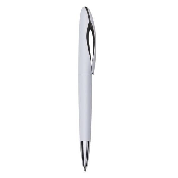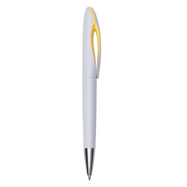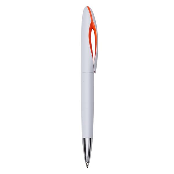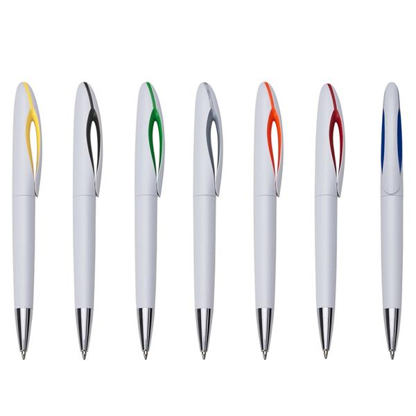 Caneta plástica branca com detalhe colorido. Clip plástico com detalhe interno colorido, aciona por giro. Medidas aproximadas para gravação (CxL): 5 cm x 0,7 cm Tamanho total aproximado (CxL): 14,5 cm x 1,5 cm Peso aproximado (g): 11