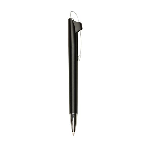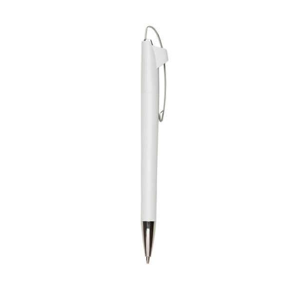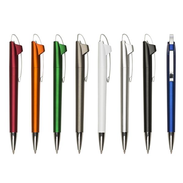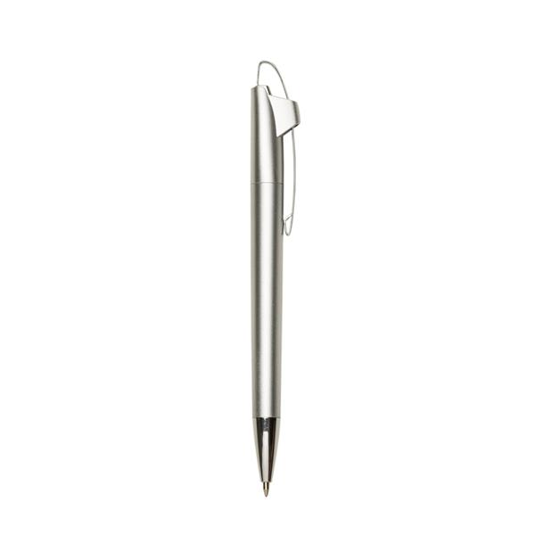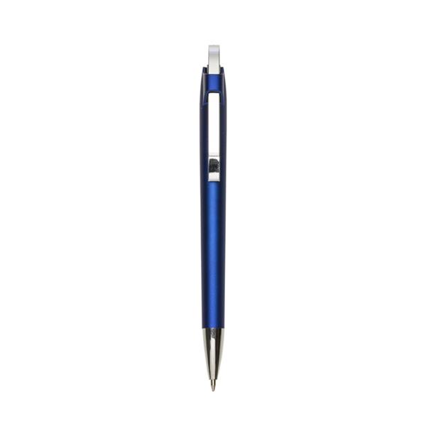 Caneta plástica fosca inteira colorida com detalhes prata. Clip metal brilhante “vazado”. Aciona por clique. Medidas aproximadas para gravação (CxL): 3,5 cm x 0,7 cm Tamanho total aproximado (CxL): 14,5 cm x 1,7 cm Peso aproximado (g): 10