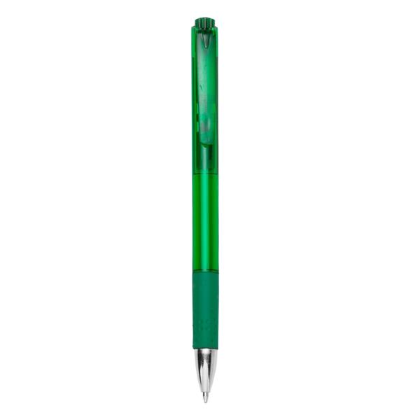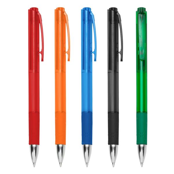 Caneta plástica translúcida colorida com detalhe inferior emborrachado. Aciona por clique e é destravado pressionando a parte inferior do clip. Largura : 0,7 cm Comprimento : 4 cm Peso aproximado (g): 7