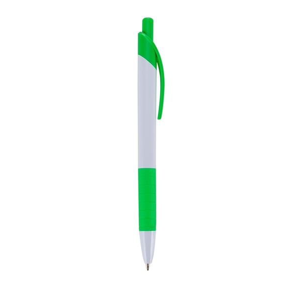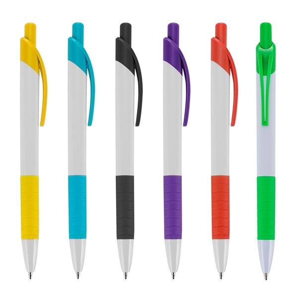 Caneta plástica branca com detalhes coloridos. Clip plástico possui detalhe vazado e parte inferior possui detalhe emborrachado com relevo. Aciona por clique. Largura : 1 cm Comprimento : 14,1 cm Medidas aproximadas para gravação (CxL): 6 cm x 1 cm Peso aproximado (g): 7