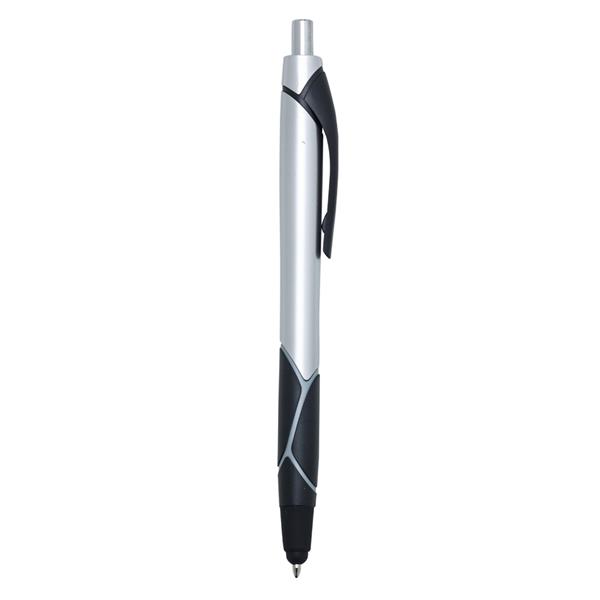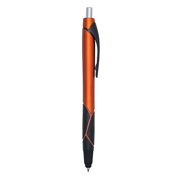 Caneta plástica colorida com borracha touch. Clip plástico preto com acionador prata, possui três detalhes na parte inferior emborrachados. Aciona por clique, sai atrávés do touch a esferográfica Medidas aproximadas para gravação (CxL): 4 cm x 0,7 cm Tamanho total aproximado (CxL): 14,4 cm x 1,5 cm Peso aproximado (g): 10