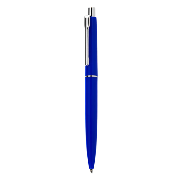 Caneta plástica com clip metálico esferográfica retrátil escrita azul.