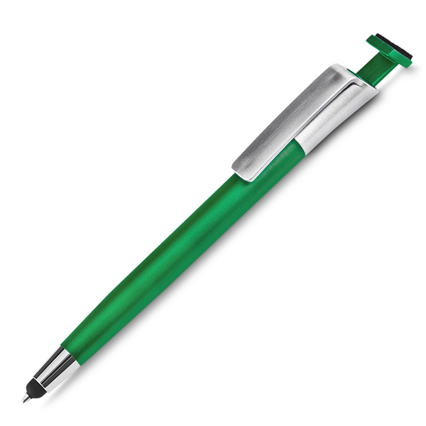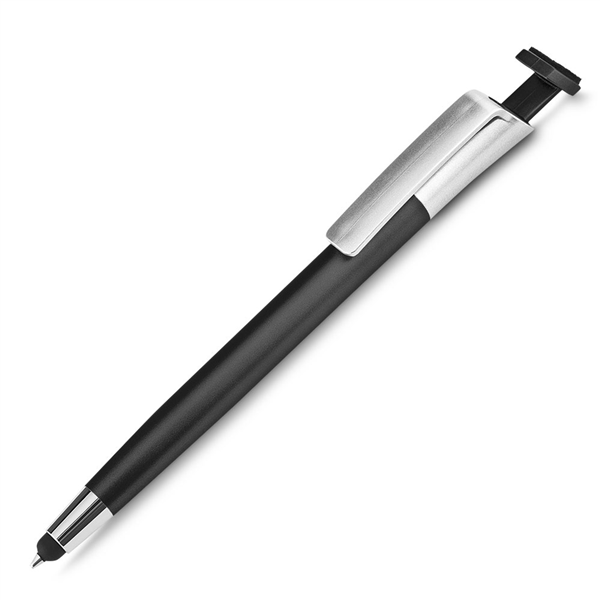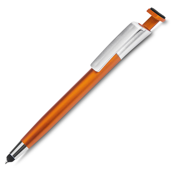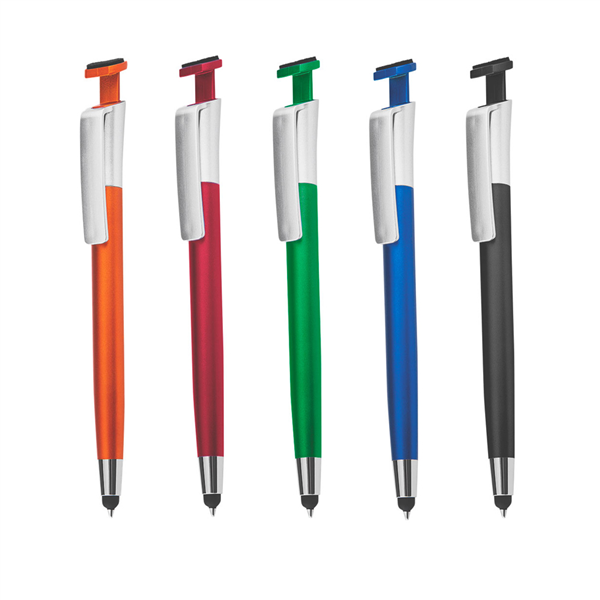 caneta plástica com ponta touch, suporte para celular e limpa tela