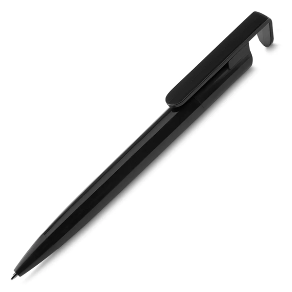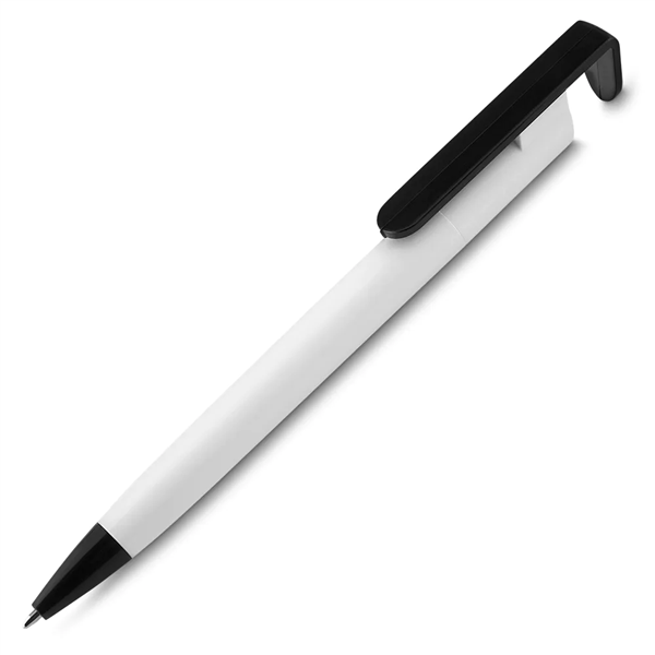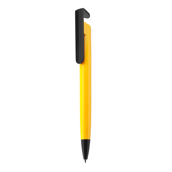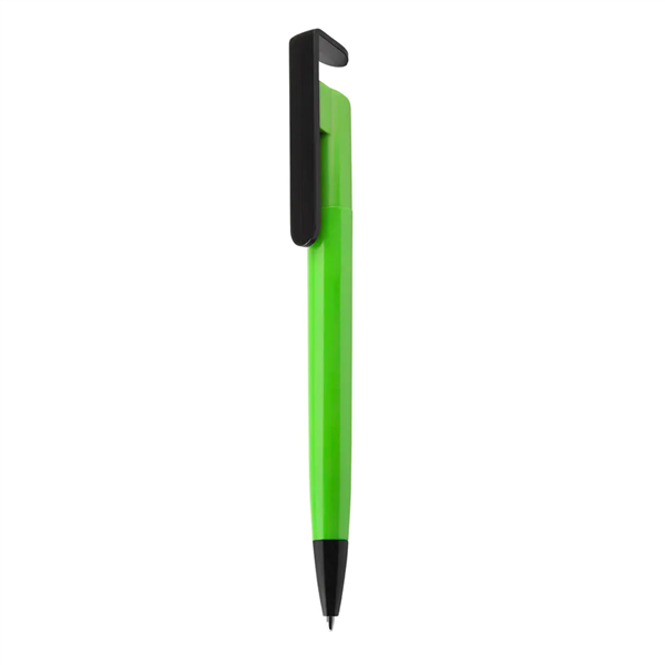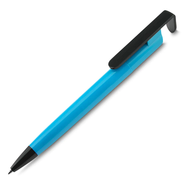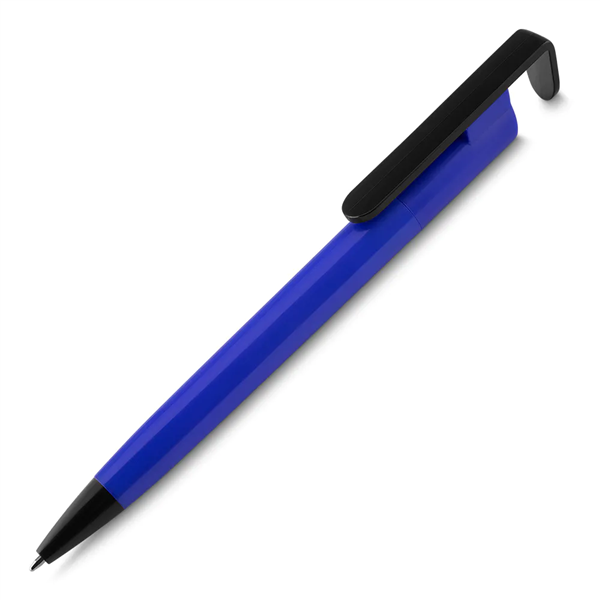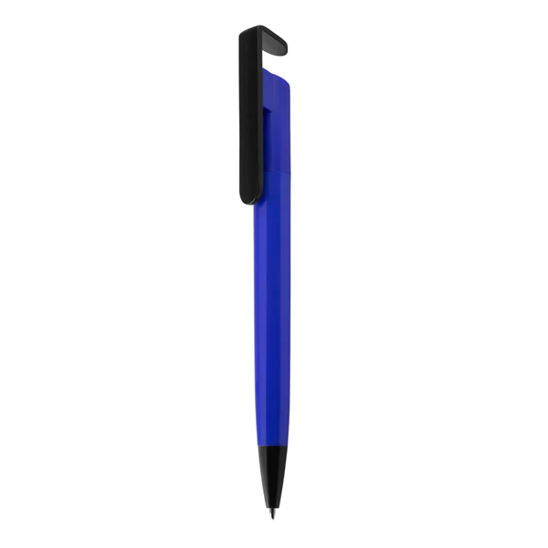 Caneta plástica com suporte para celular, retrátil, esferográfica com escrita azul.