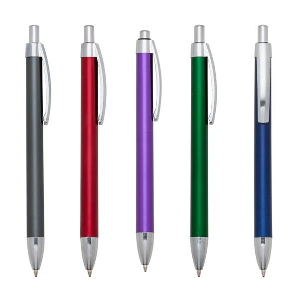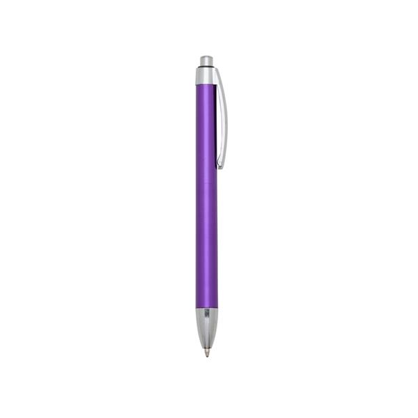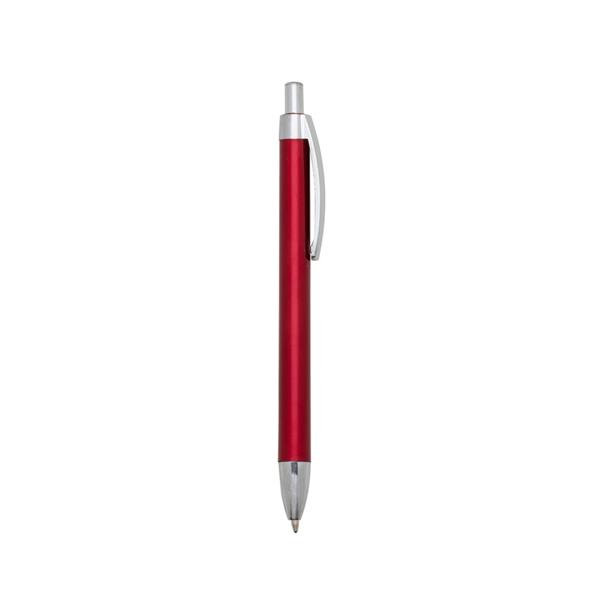 Caneta plástica de pintura metalizada colorida e acessórios prata. Clip metálico de acionador e ponteira prata. Aciona por clique. Medidas aproximadas para gravação (CxL): 4 cm x 0,7 cm Tamanho total aproximado (CxL): 13,6 cm x 1,5 cm Peso aproximado (g): 7