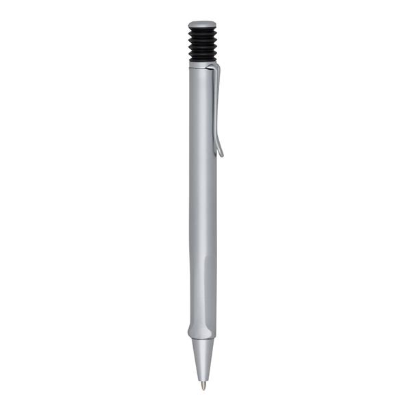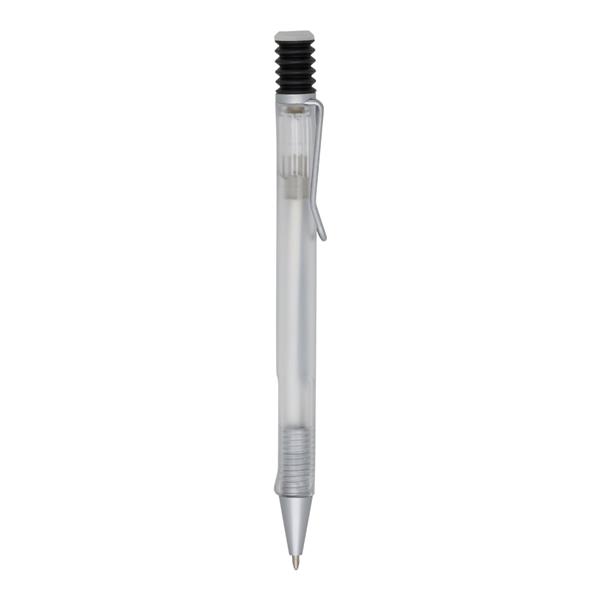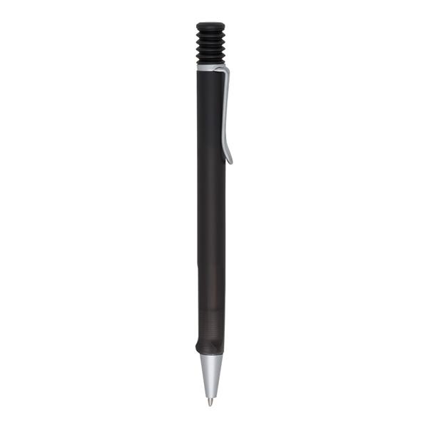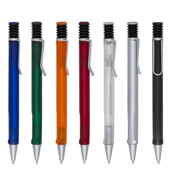 Caneta plástica fosca inteira colorida com detalhes prata. Acionador com design de mola e clip metal, possui relevo na parte inferior. Aciona por clique. Medidas aproximadas para gravação (CxL): 3,5 cm x 0,9 cm Tamanho total aproximado (CxL): 13,8 cm x 1,4 cm Peso aproximado (g): 8