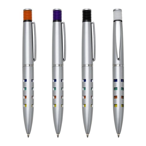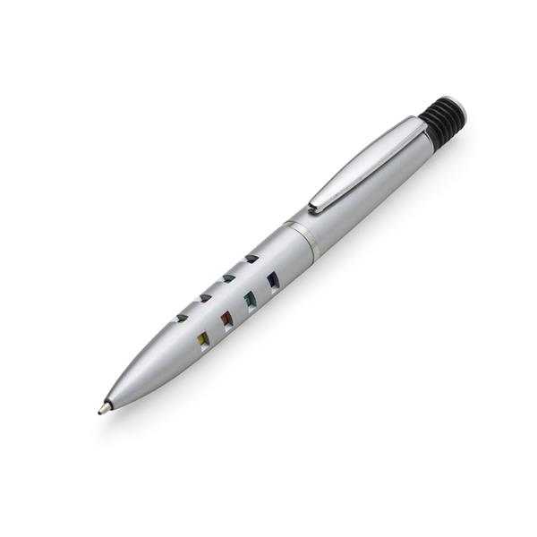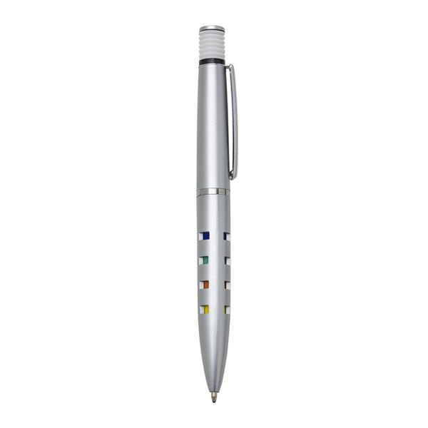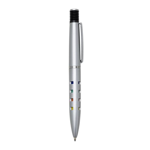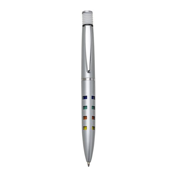 Caneta plástica inteira prata com detalhes coloridos. Possui clip de metal, acionador de mola(colorido) com anel preto sustentando, anel prata centralizado e dezesseis “janelas” vazadas ao acionar a caneta ficam coloridas. Aciona por clique. Medidas aproximadas para gravação (CxL): 4,5 cm x 1 cm Tamanho total aproximado (CxL): 13,6 cm x 1,5 cm Peso aproximado (g): 10