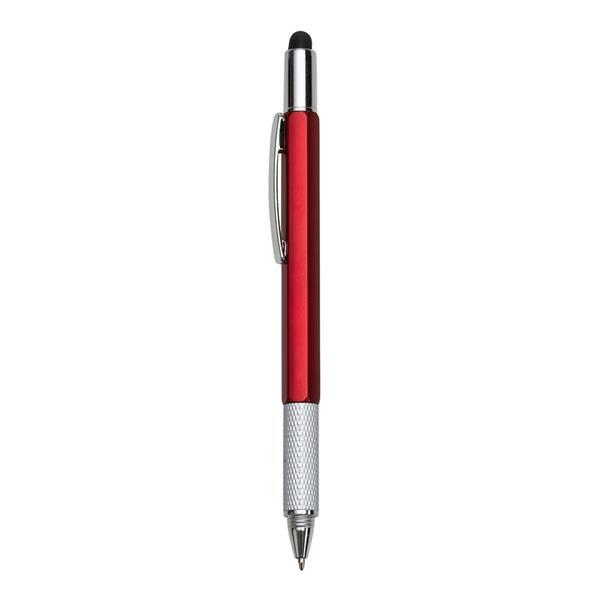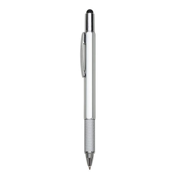 Caneta plástica multifunções, contém réguas com medição em centímetros (alcance 7cm) e polegadas (alcance 3pol), medidor de nível, compartimento superior touch que pode ser desrosqueado para o acesso de mini chaves: Philips e Fenda. Caneta com pintura colorida e detalhes em prata, possui clip metálico e área inferior texturizada. Acionamento por rotação, carga esferográfica na cor azul. Largura : 1,4 cm Comprimento : 14,8 cm Medidas aproximadas para gravação (CxL): 4 cm x 0,5 cm Peso aproximado (g): 12