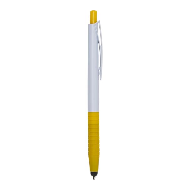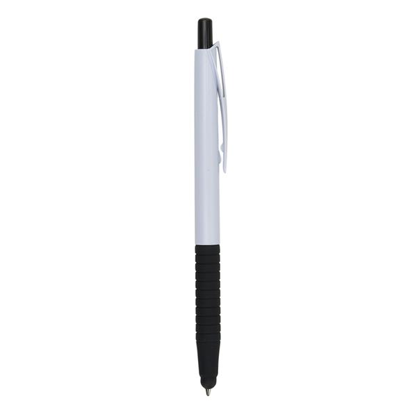 Caneta plástica com ponteira touch screen, carga esferográfica azul e acionamento por clique. Medidas aproximadas para gravação (CxL): 4 cm x 0,6 cm Tamanho total aproximado (CxL): 14 cm x 1,3 cm Peso aproximado (g): 8