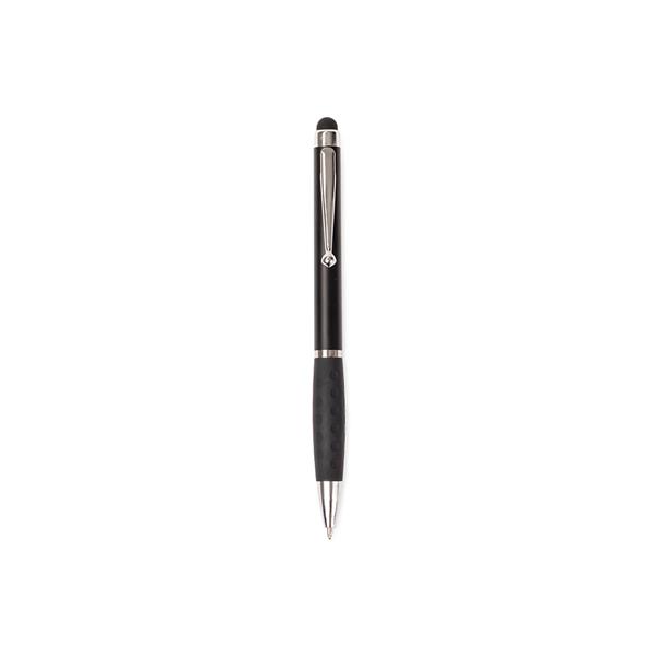 Caneta plástica com ponta, clip e pequenos detalhes em metal, além de detalhes ergonômicos na área próxima à tampa. Possui acionamento por rotação, carga esferográfica azul de 1.0mm e ponteira emborrachada para interação com dispositivos de telas sensíveis ao toque.