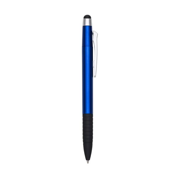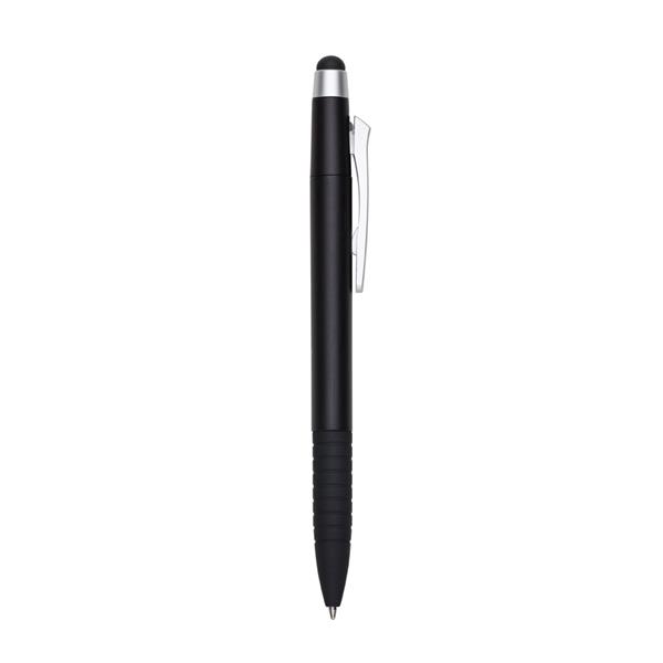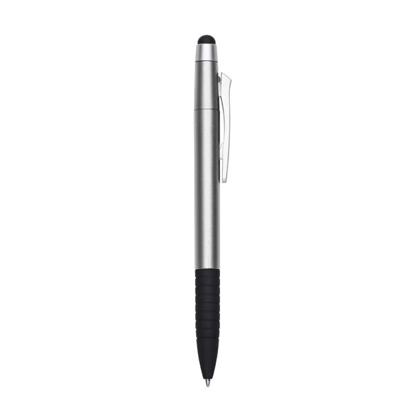 Caneta plástica touch com pintura fosca. Borracha touch na ponteira superior, anel e clip em prata e parte inferior emborrachada com oito anéis pretos em relevo. Esfereográfica aciona pelo clip Medidas aproximadas para gravação (CxL): 4 cm x 0,7 cm Tamanho total aproximado (CxL): 14,4 cm x 1,5 cm Peso aproximado (g): 8