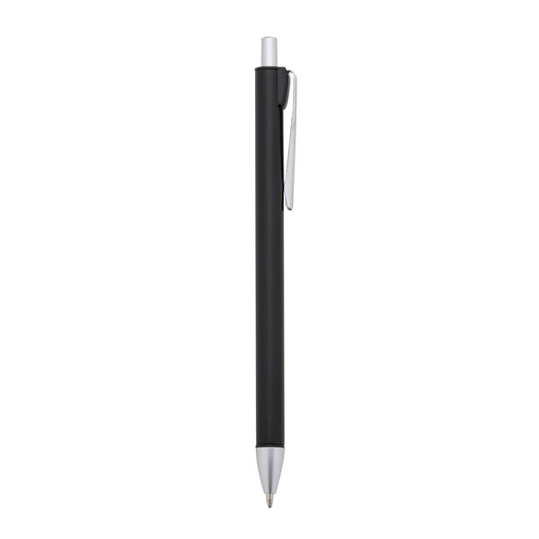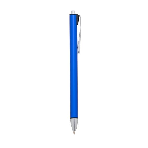 Caneta semimetal inteira colorida com detalhes prata. Clip metal, suporte do acionar e anel inferior preto. Aciona por clique Medidas aproximadas para gravação (CxL): 4,2 cm x 0,6 cm Tamanho total aproximado (CxL): 13,7 cm x 1,2 cm Peso aproximado (g): 13