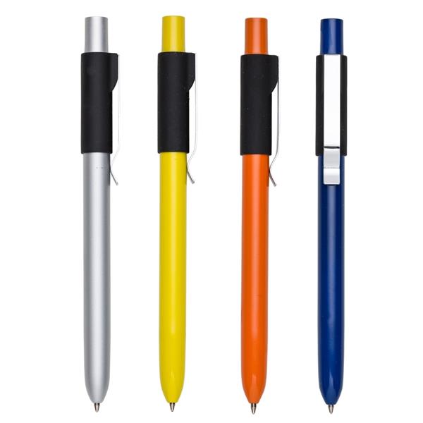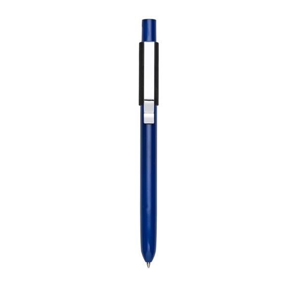 Caneta semimetal colorida com detalhe plástico preto superior. Possui clip metálico prata, aciona por clique Medidas aproximadas para gravação (CxL): 3,6 cm x 0,7 cm Tamanho total aproximado (CxL): 14,2 cm x 1,5 cm Peso aproximado (g): 19