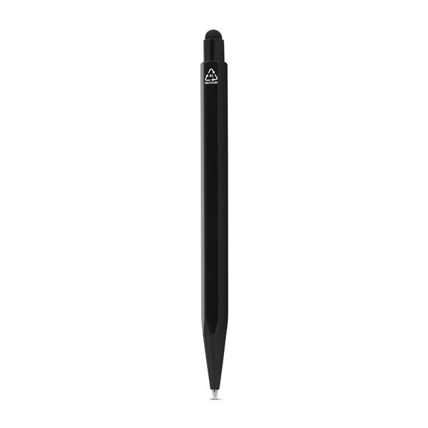 Conjunto composto por chaveiro pé de galinha em alumínio reciclado e caneta de acionamento em alumínio reciclado, com régua no corpo e sem clipe.