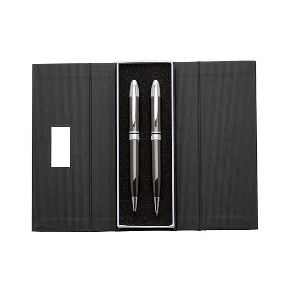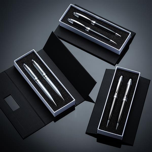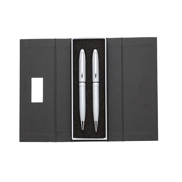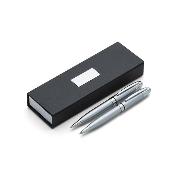 Conjunto caneta e lapiseira em estojo de cartonagem com placa central para personalização. Clip metal e anel central possui: anel fino prata, anel preto fino e um anel maior prata com relevo e acionam por giro. Estojo revestida com espuma na parte interna Largura : 6,5 cm Comprimento : 18 cm Medidas aproximadas para gravação (CxL): Caneta/Lapiseira 3,7 cm x 1,2 cm – Estojo 4,1 cm x 1,6 cm Tamanho total aproximado (CxL): Caneta/Lapiseira 14 cm x 1,6 cm Peso aproximado (g): 130