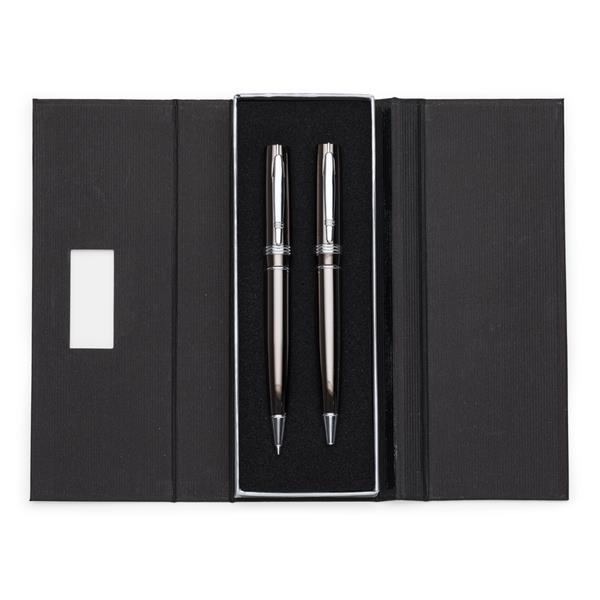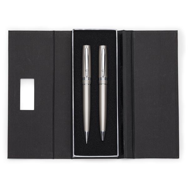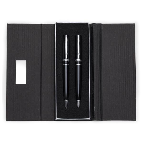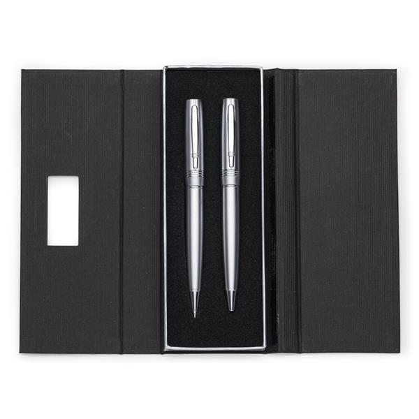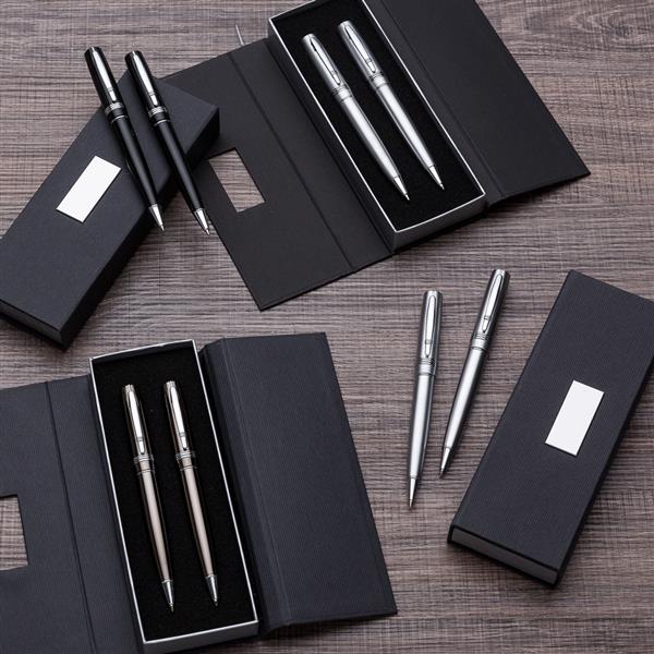 Conjunto caneta e lapiseira em estojo de cartonagem com placa central para personalização. Caneta/Lapiseira metal inteira colorida com detalhes prata, clip metal com duas “linhas” e na “ponta” superior detalhe de uma linha no meio. Possui três anéis abaixo do clip, anel centralizado e anel inferior e acionam por giro. Estojo revestida com espuma na parte interna. Medidas aproximadas para gravação (CxL): Caneta/Lapiseira 4,3 cm x 1 cm – Estojo 4,1 cm x 1,6 cm Tamanho total aproximado (CxL): Caneta/Lapiseira 13,2 cm x 1,4 cm – Estojo 18 cm x 6,5 cm Peso aproximado (g): 135