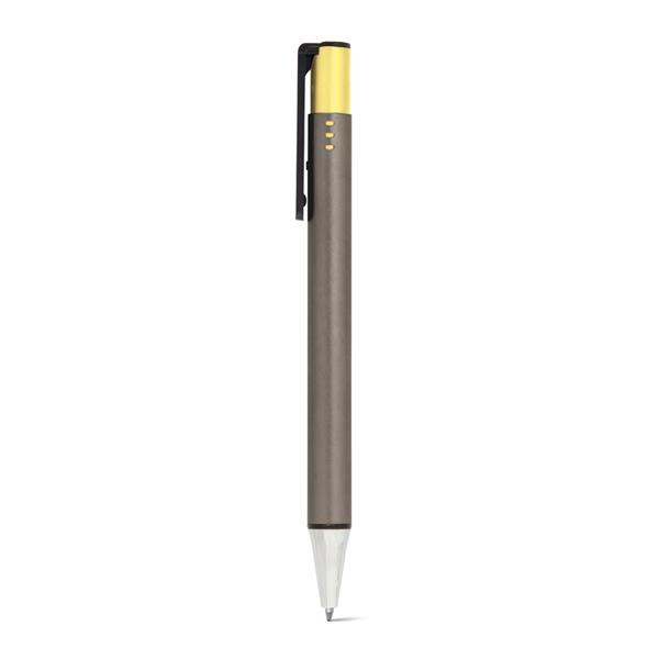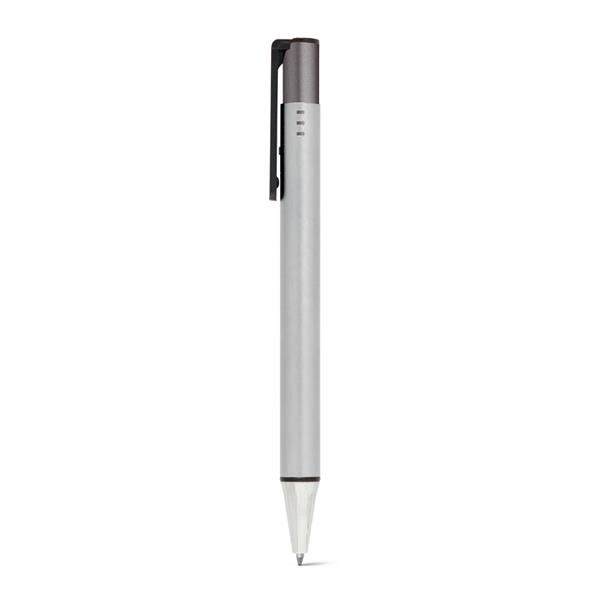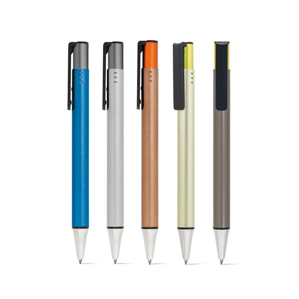Esferográfica. Alumínio e ABS. Acabamento metalizado. 1,5km de escrita. ø11 x 142 mm