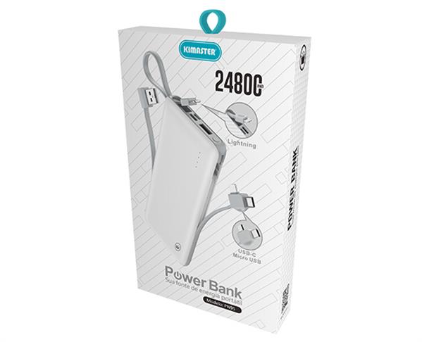 O Carregador Portátil PN959X KIMASTER tem um design robusto. O uso do acessório é bastante intuitivo, bastando apenas conecta-lo ao aparelho que se deseja carregar, o Power Bank já mostrará a carga restante com suas luzes LED azul, ao desconectar o acessório desliga após alguns poucos segundos. O PN959X vem com um cabo Lightning acoplado e um cabo removível Type-C/Micro USB/USB. Não há problemas incompatibilidade de Software, podendo ser utilizado com qualquer versão de um aparelho IOS, ANDROID ou WINDOWS PHONE. – Carregador com cabo Lightning acoplado – Possui porta USB e luz indicativa de carga – Alta eficiência de conversão da bateria – Desligamento automático – Dispositivo inteligente interno que protege contra sobrecarga – Compatível com smartphones, iPhone, consoles de jogos portáteis, câmeras digitais e outros dispositivos portáteis. Especificações: Capacidade real: 24800 mAh Entrada: DC 5V/2.1A Saída 1: DC 5V/2.4A Saída 2: DC 5V/2.4A Saída 3: DC 5V/2.4A Dimensões (embalagem): 10,3 x 17,5 x 3,4 cm