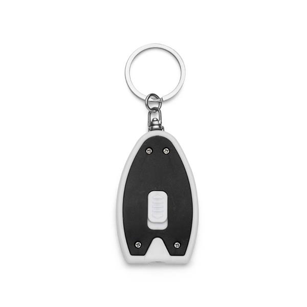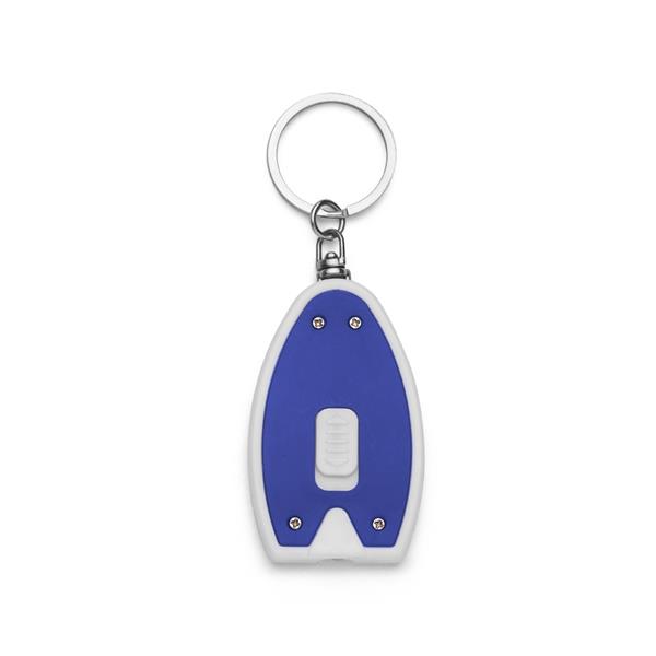 Chaveiro lanterna de plástico colorido com detalhe branco. Possui um botão para ligar/desligar lanterna, acompanha 3 baterias AG1. Medidas aproximadas para gravação (CxL): 3 cm x 2 cm Tamanho total aproximado (CxL): 9,3 cm x 3,5 cm Peso aproximado (g): 11