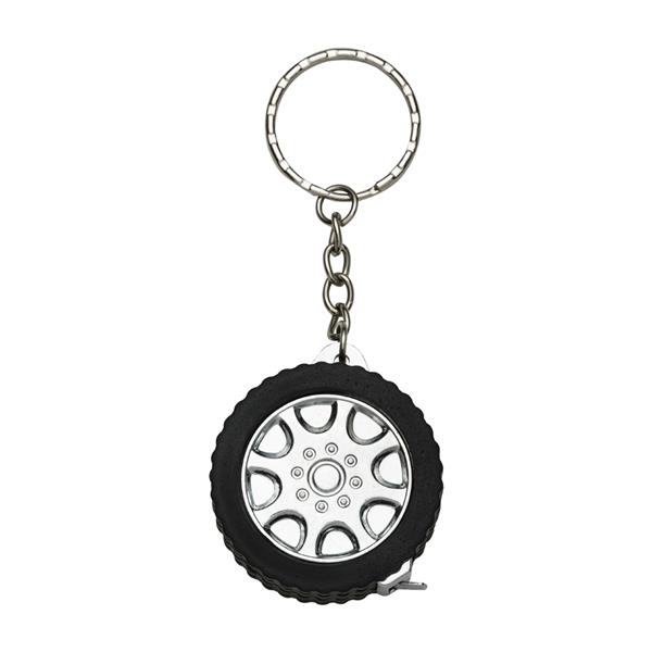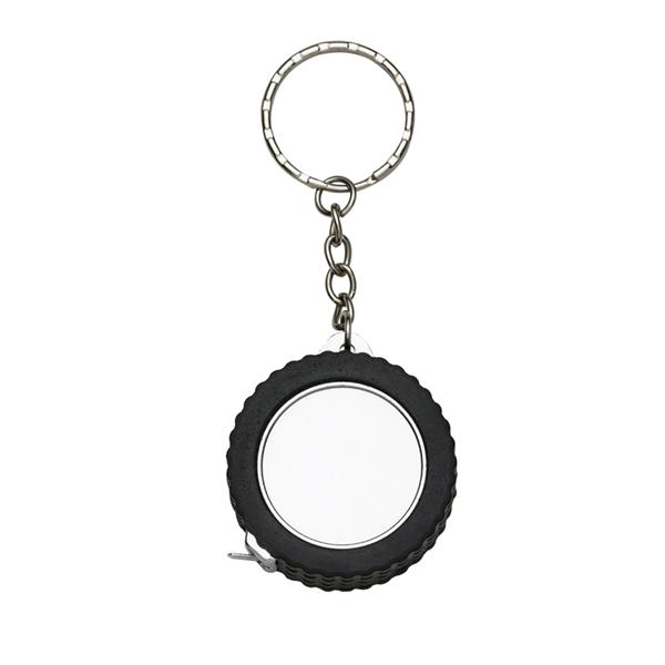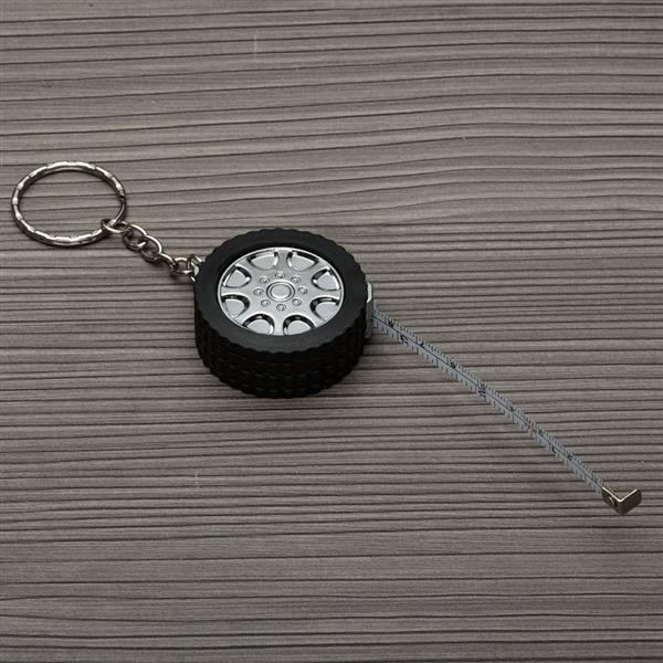 Chaveiro trena 1 metro formato pneu brilhante, material emborrachado com relevo. Detalhes do aro em plástico prata, verso liso. Trena não possui trava. Medidas aproximadas para gravação (CxL): 2,6 cm x 2,6 cm Tamanho total aproximado (CxL): 10,1 cm x 4,1 cm Peso aproximado (g): 24