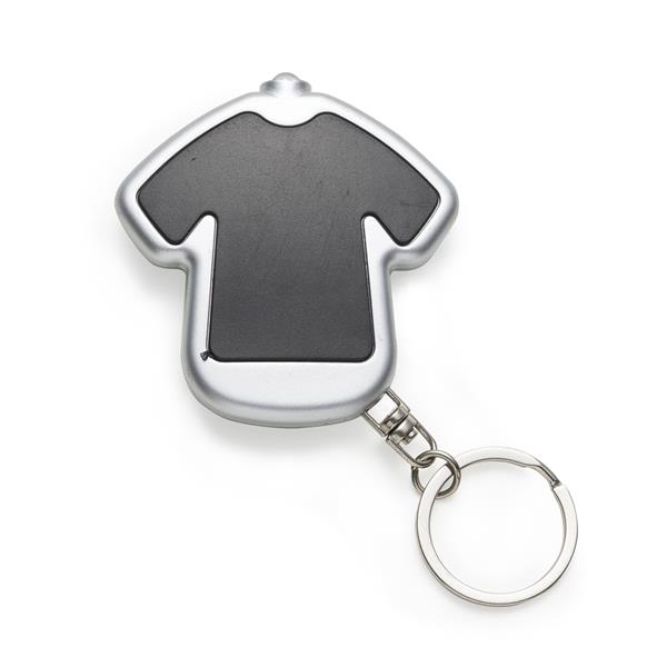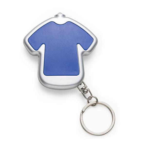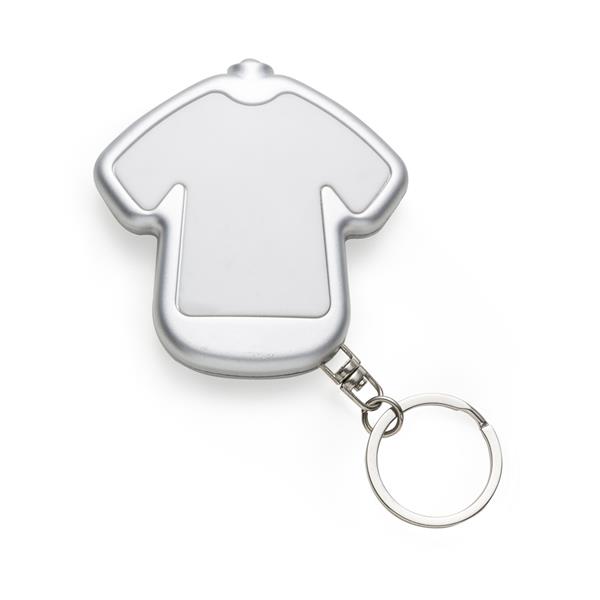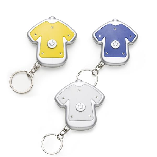 Chaveiro lanterna plástico formato camiseta colorida com contorno prata. Frente lisa e verso com parafusos e botão para acender lanterna. Acompanha duas baterias(CR1220 e L1130). Medidas aproximadas para gravação (CxL): 3,8 cm x 4,5 cm Tamanho total aproximado (CxL): 5,6 cm x 5,4 cm Peso aproximado (g): 14