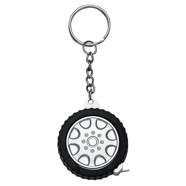 Chaveiro trena 1 metro formato pneu fosco, material emborrachado com relevo. Detalhes do aro em plástico prata, verso liso. Trena não possui trava. Medidas aproximadas para gravação (CxL): 2,2 cm x 2,2 cm Tamanho total aproximado (CxL): 10,1 cm x 4,1 cm Peso aproximado (g): 24