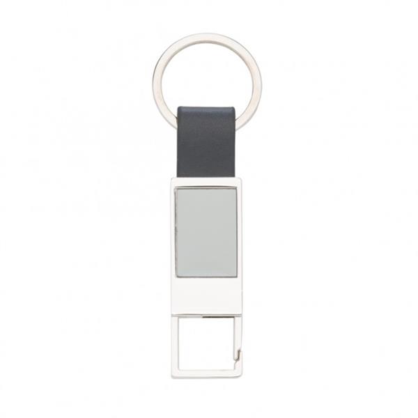 Chaveiro de metal com mosquetão e detalhe em couro sintético. Chaveiro metálico com chapa central de alumínio na cor grafite e verso liso brilhante com detalhes do parafuso, possui alça de couro sintético. Mosquetão sem trava Medidas aproximadas para gravação (CxL): 1,7 cm x 2,5 cm Tamanho total aproximado (CxL): 10,2 cm x 3,2 cm Peso aproximado (g): 35