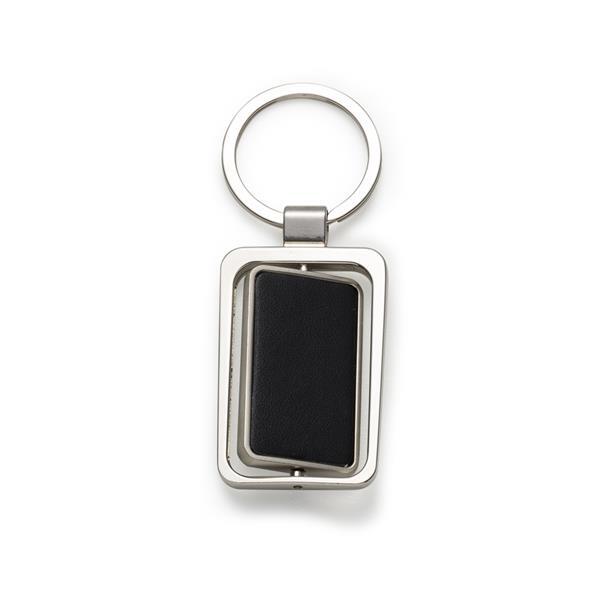 Chaveiro metal giratório retangular. Um dos lados metal fosco e verso preto emborrachado. Medidas aproximadas para gravação (CxL): 4 cm x 2,4 cm Tamanho total aproximado (CxL): 8,6 cm x 3,3 cm Peso aproximado (g): 34