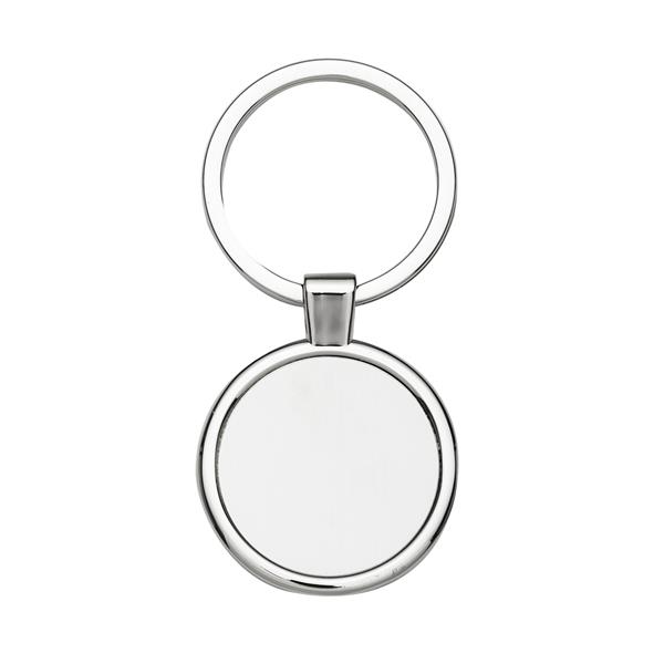 Chaveiro de metal redondo com chapa central, verso liso. Tamanho total aproximado (CxL): 7,2 cm x 3,6 cm Peso aproximado (g): 21