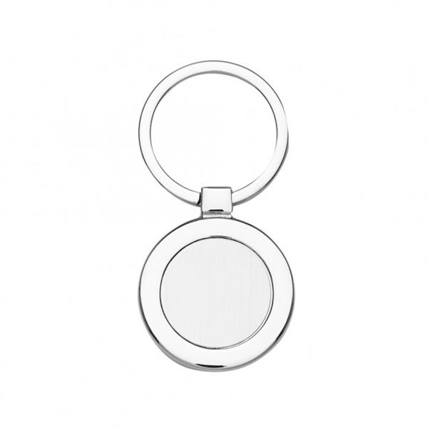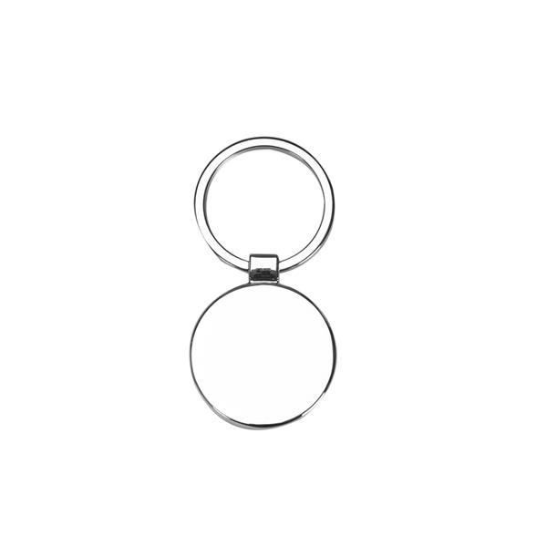 Chaveiro de metal redondo com chapa central, verso liso. Medidas aproximadas para gravação (CxL): 2,3 cm x 2,3 cm Tamanho total aproximado (CxL): 6,7 cm x 3,3 cm Peso aproximado (g): 29