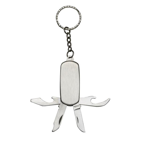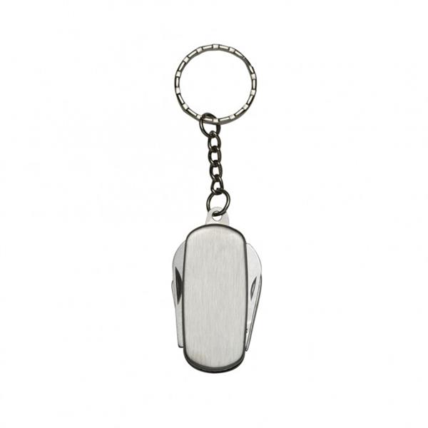 Chaveiro canivete 4 funções de metal liso(ambos lados). Possui: abridor de lata, lixa, lâmina de corte e abridor de garrafa. Medidas aproximadas para gravação (CxL): 4,1 cm x 1,8 cm Tamanho total aproximado (CxL): 5 cm x 2,7 cm Peso aproximado (g): 27
