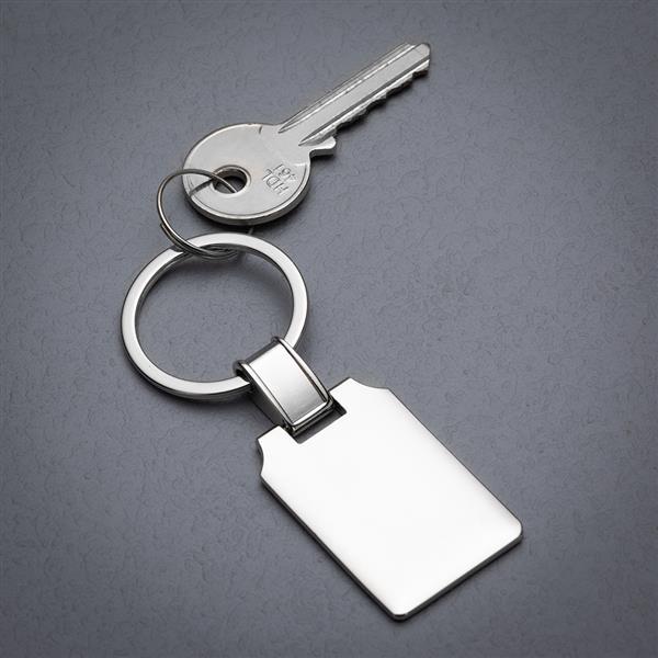 Chaveiro metal retangular brilhante, frente e verso iguais, suporte da argola giratório. Altura : 9 cm Largura : 3,5 cm Medidas aproximadas para gravação (CxL): 3,9 cm x 2,9 cm Peso aproximado (g): 33