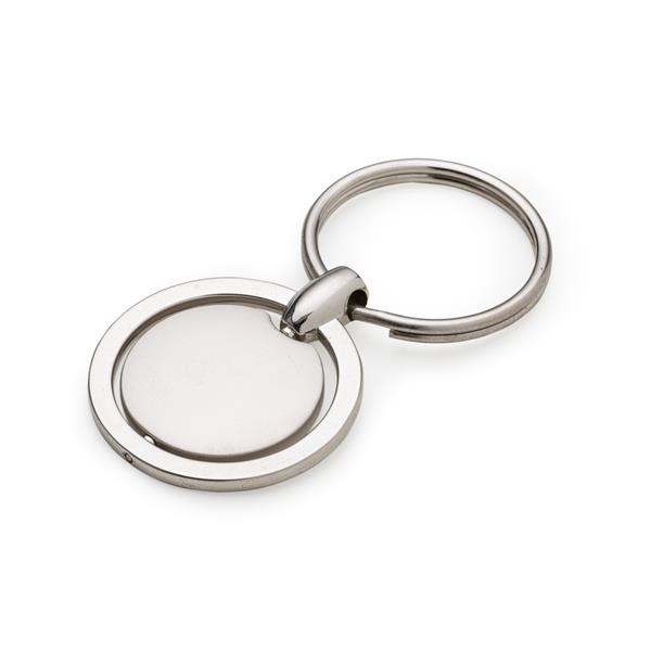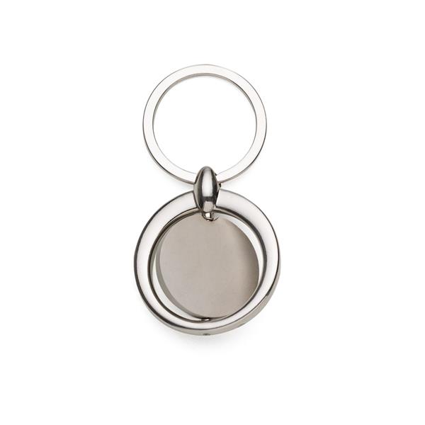 Chaveiro metal redondo giratório, chapa central fosca. Medidas aproximadas para gravação (CxL): 2,3 cm x 2,5 cm Tamanho total aproximado (CxL): 7 cm x 3,4 cm Peso aproximado (g): 24