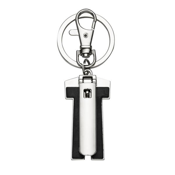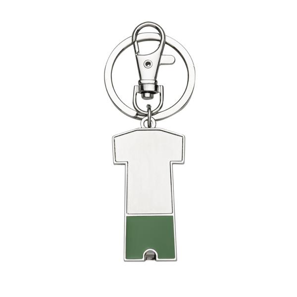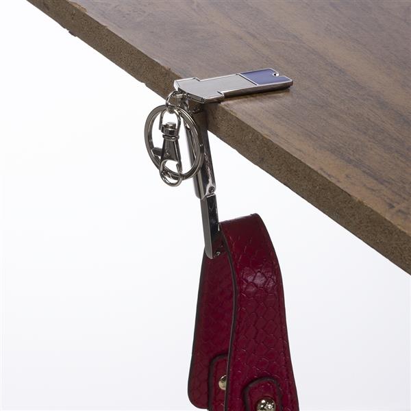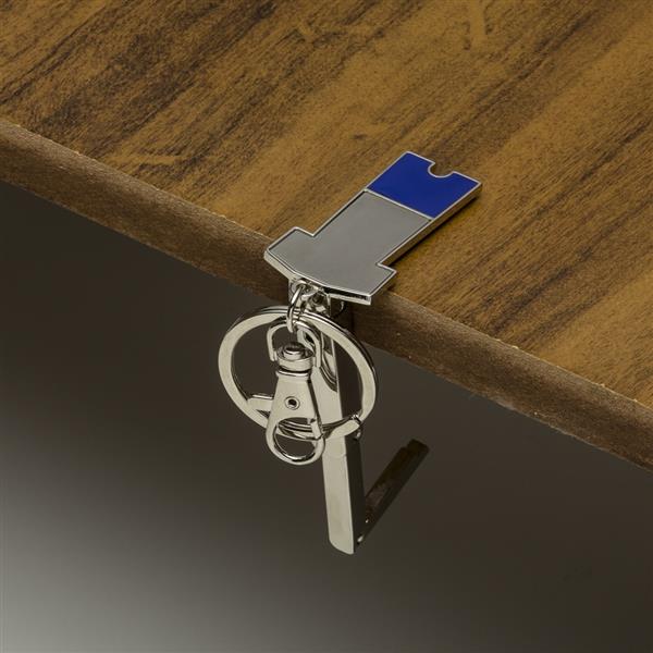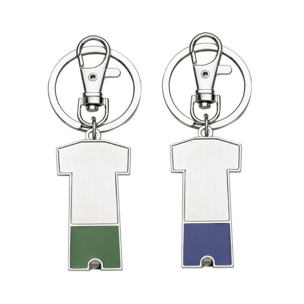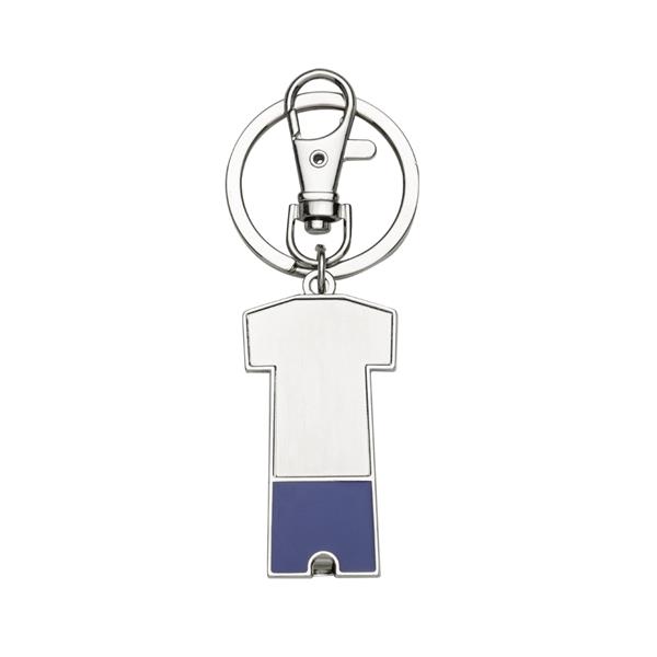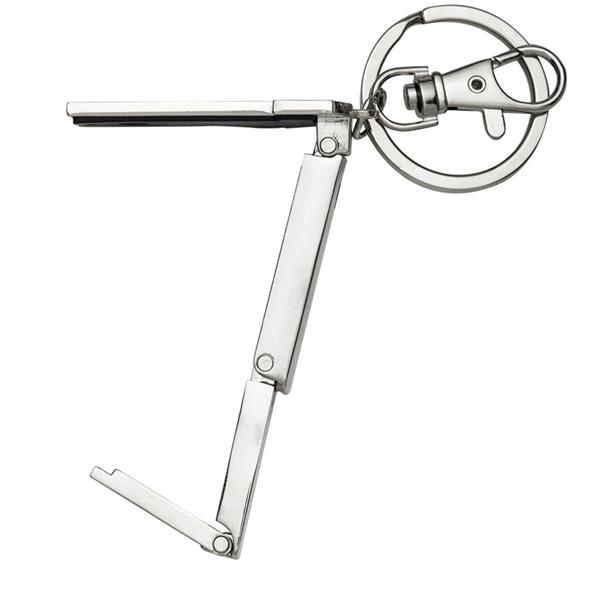 Chaveiro metal porta bolsa dobrável formato uniforme. Parte traseira com borracha anti deslizante, possui além do chaveiro um gancho prendedor. Para utilizar o porta bolsa basta puxar o compartimento traseiro(é imantado) e abri-lo. Medidas aproximadas para gravação (CxL): 3,2 cm x 1,6 cm Tamanho total aproximado (CxL): 9,2 cm x 3,4 cm Peso aproximado (g): 41
