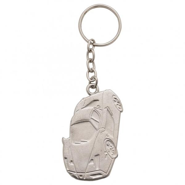 Chaveiro metal formato carro esportivo, frente com detalhes em relevo e verso liso com contorno retangular. Medidas aproximadas para gravação (CxL): 4 cm x 2,3 cm Tamanho total aproximado (CxL): 10,7 cm x 3,5 cm Peso aproximado (g): 19