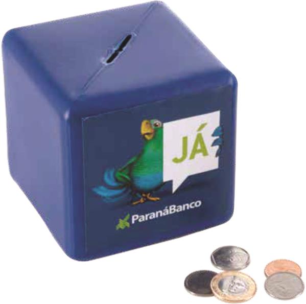 Cofrinho personalizado em formato de cubo é um brinde personalizado que permite a gravação da logo em diversos locais do produto.