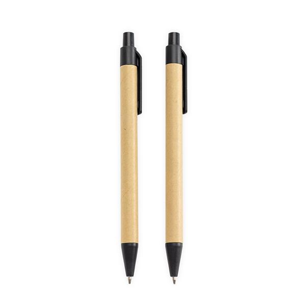 Kit de caneta e lapiseira ecológicos com estojo em papelão. A caneta possui corpo em papelão com ponta, clipe e acionamento por clique em plástico, além de carga esferográfica azul de 1,0 mm. A lapiseira segue o mesmo design, equipada com mina de grafite de 0,7 mm. Largura : 5,4 cm Espessura : 1,3 cm Comprimento : 17,2 cm Peso aproximado (g): 16