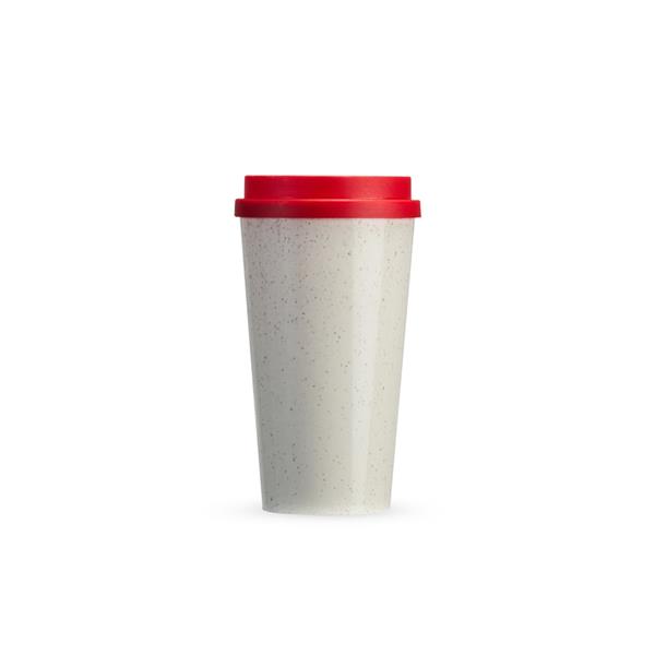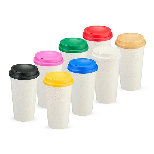 Copo em fibra de arroz com capacidade de até 550 ml. Possui tampa protetora com bocal.