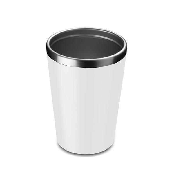 Copo de 350 ml com parede dupla, interior em inox 304 e exterior em plástico PP, tampa em plástico PP e acabamento com pintura fosca.