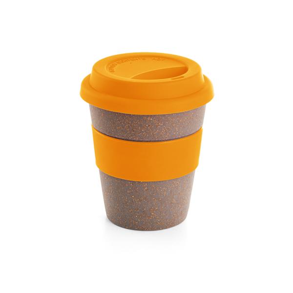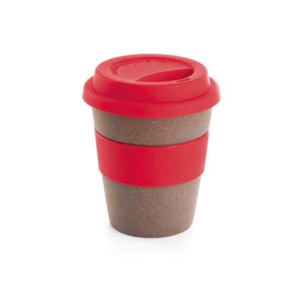 Copo de viagem. Fibra de bambu e PP. Com tampa e banda em silicone. Capacidade: 390 ml. Food grade. Retirar tampa antes de colocar no micro-ondas. Ø95 x 113 mm